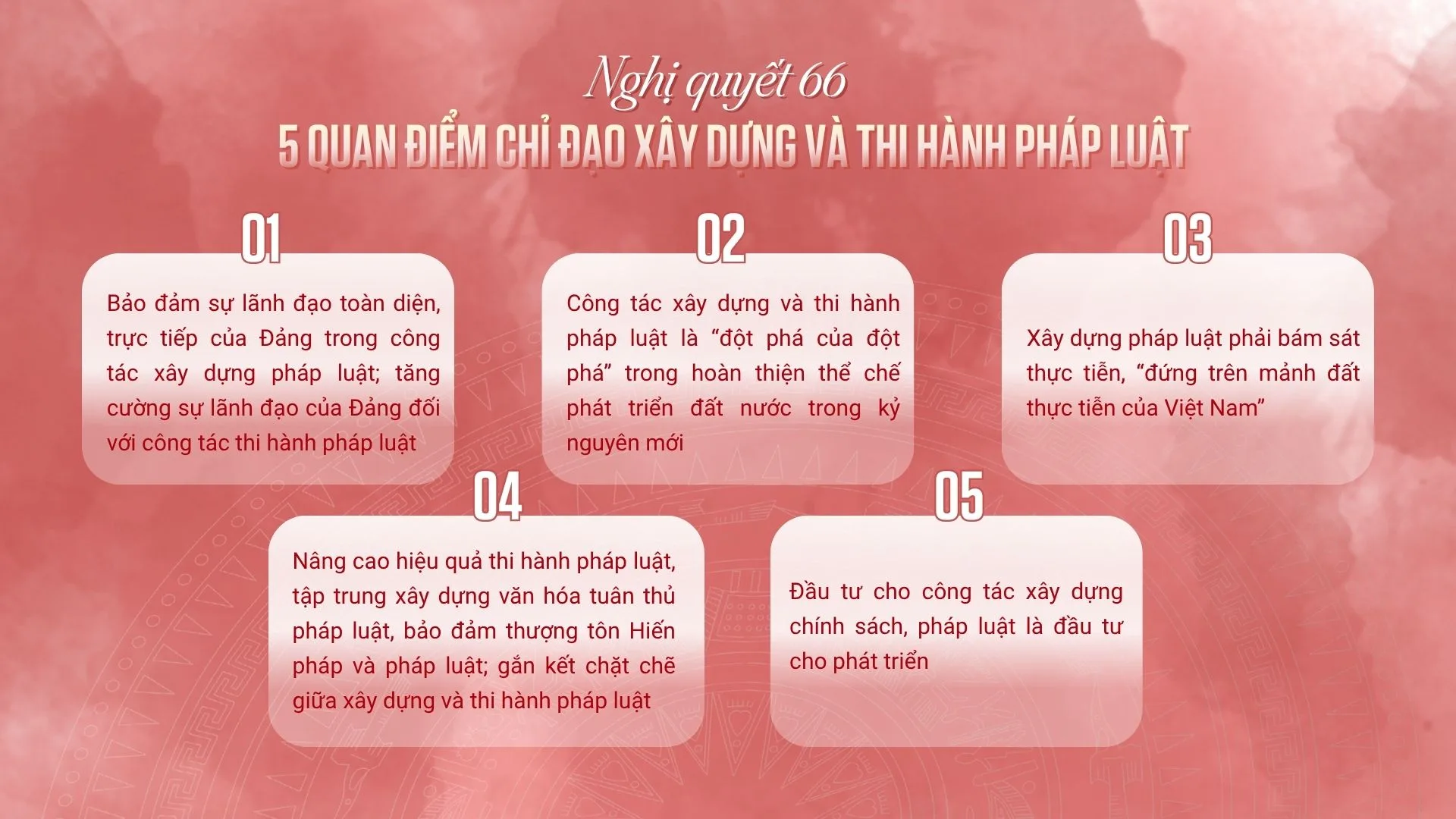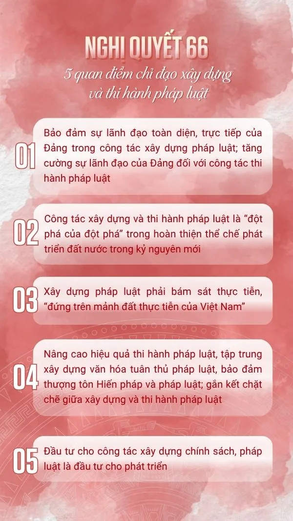Nghị quyết 66 do Bộ Chính trị ban hành đánh dấu thay đổi căn bản trong tư duy lập pháp. Thay vì xem pháp luật đơn thuần là công cụ quản lý nhà nước, công cụ điều chỉnh hành vi xã hội, Nghị quyết đã nâng tầm, xem pháp luật là cơ sở tổ chức, vận hành quyền lực Nhà nước, là nền tảng vững chắc để bảo vệ quyền con người, quyền công dân, là công cụ kiến tạo phát triển, thúc đẩy sự đổi mới và sáng tạo, đòn bẩy cho phát triển kinh tế – xã hội, nâng cao vị thế và uy tín quốc gia trên trường quốc tế.