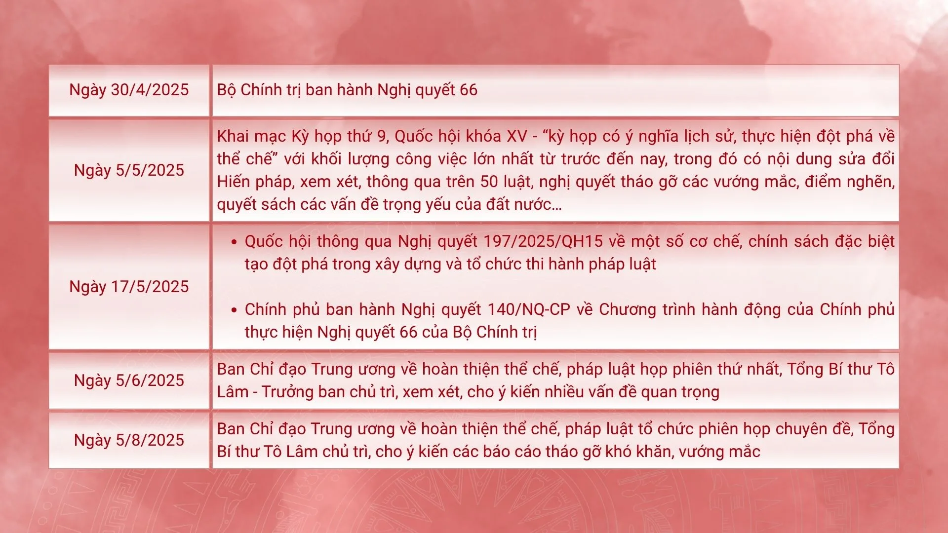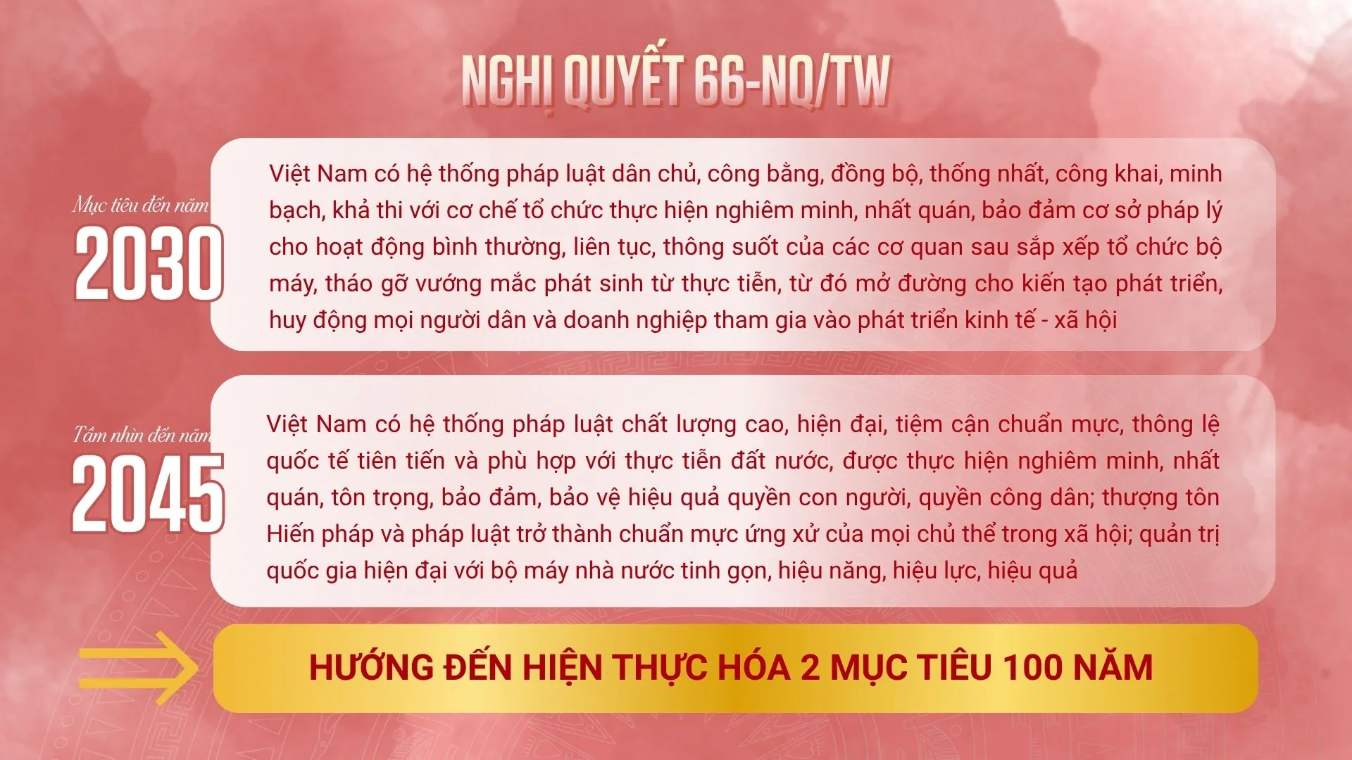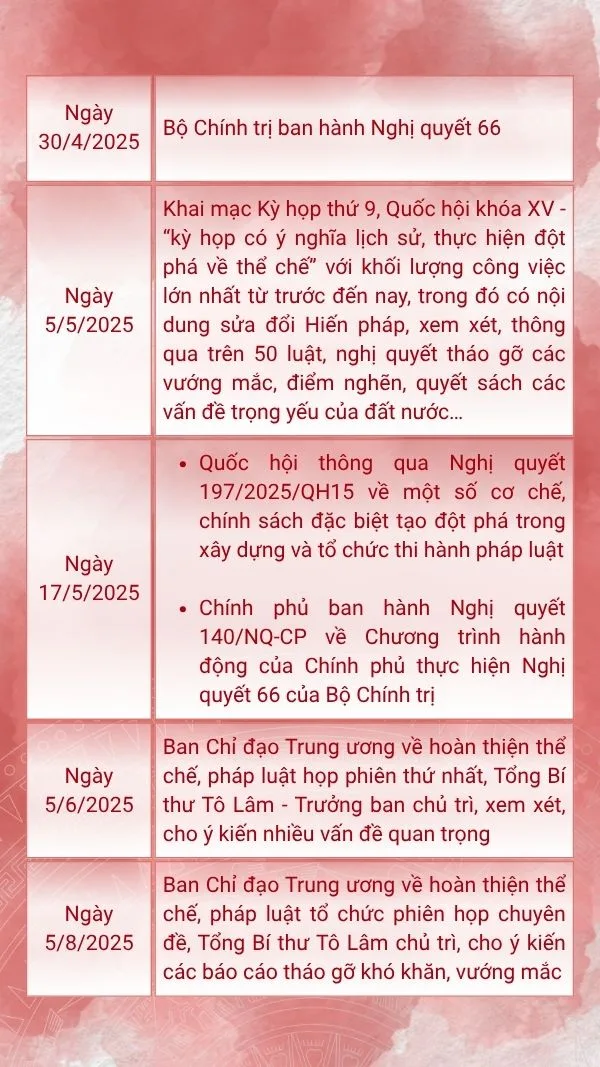 Trên bước đường thực hiện mục tiêu đến năm 2030 và tầm nhìn đến năm 2045, Nghị quyết 66 chỉ rõ: Năm 2025, cơ bản hoàn thành việc tháo gỡ những “điểm nghẽn” do quy định pháp luật. Năm 2027, hoàn thành việc sửa đổi, bổ sung, ban hành mới văn bản pháp luật bảo đảm cơ sở pháp lý đồng bộ cho hoạt động của bộ máy nhà nước theo mô hình chính quyền 3 cấp. Năm 2028, hoàn thiện hệ thống pháp luật về đầu tư, kinh doanh, góp phần đưa môi trường đầu tư của Việt Nam nằm trong nhóm 3 nước dẫn đầu ASEAN.