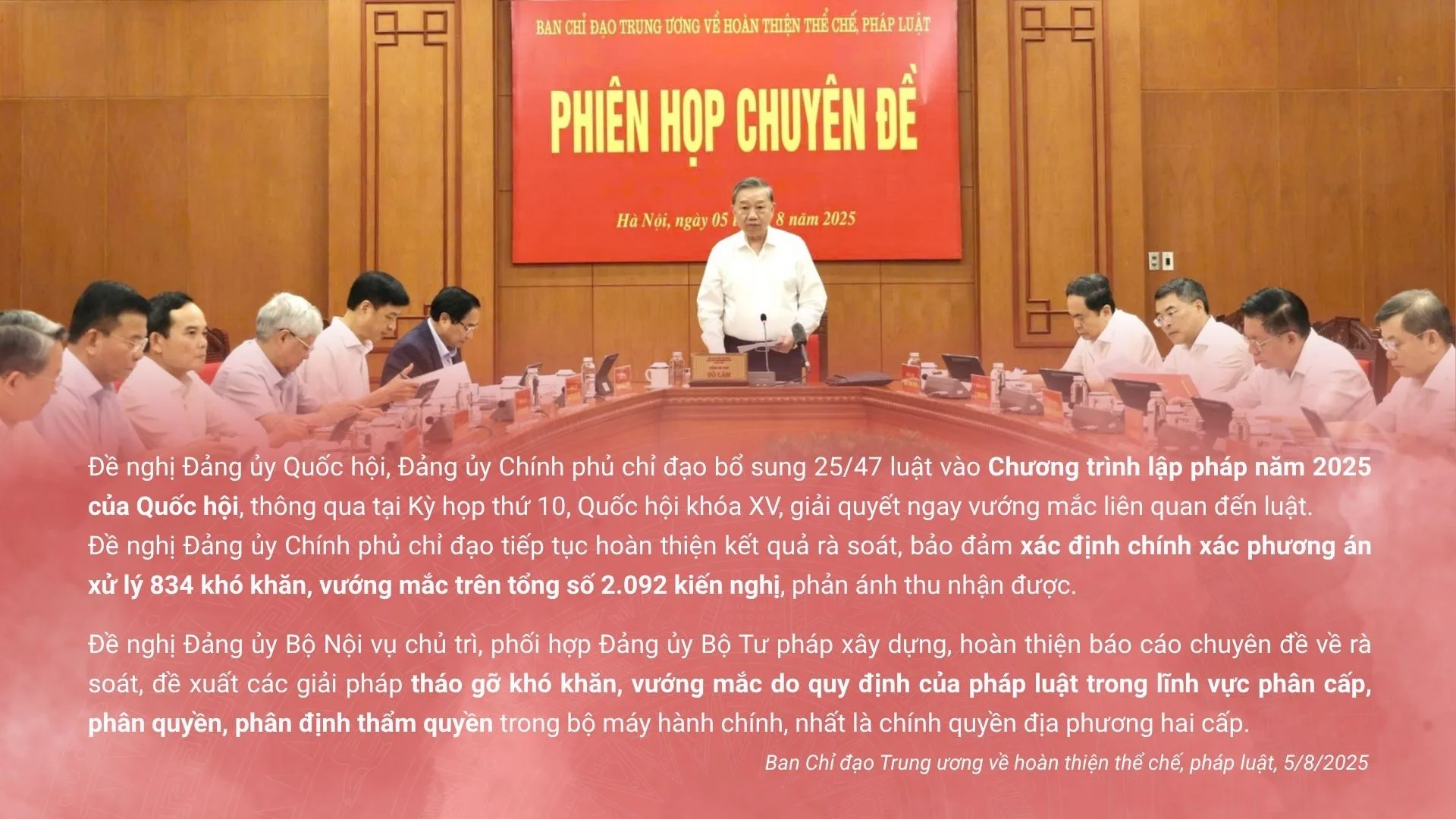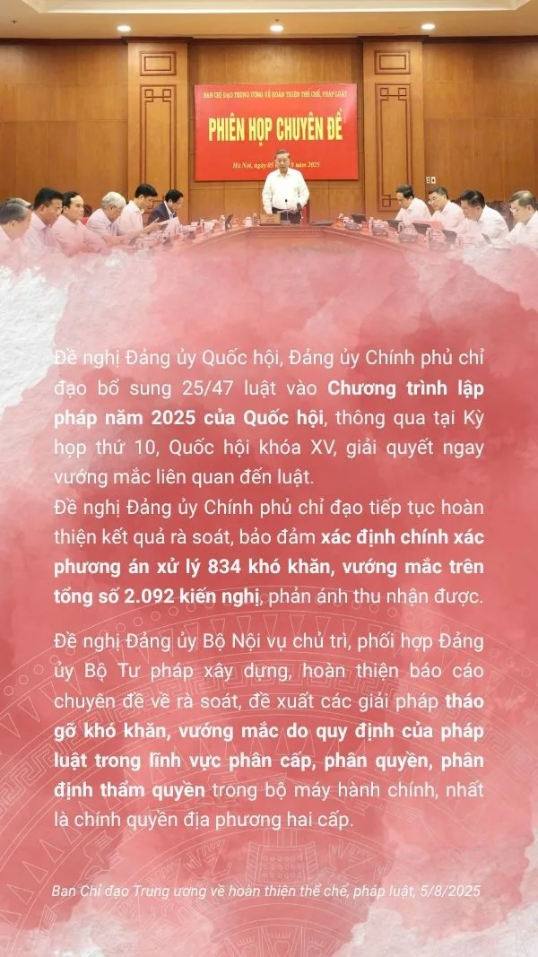 Song, Tổng Bí thư Tô Lâm cũng thẳng thắn nhìn nhận tồn tại, hạn chế, bất cập: Một số chủ trương, định hướng của Đảng chưa được thể chế hóa kịp thời, đầy đủ. Tư duy xây dựng pháp luật một số lĩnh vực còn thiên về quản lý. Chất lượng pháp luật chưa theo kịp yêu cầu thực tiễn. Quy định còn chồng chéo, mâu thuẫn, cản trở việc thực thi. Phân cấp, phân quyền chưa đủ mạnh. Thủ tục hành chính còn rườm rà, “nhiều khúc quanh”. Tổ chức thực thi pháp luật vẫn là khâu yếu. Thiếu cơ chế phản ứng chính sách kịp thời, hiệu quả. Chưa tạo khuôn khổ pháp lý thuận lợi để thúc đẩy các động lực tăng trưởng mới…