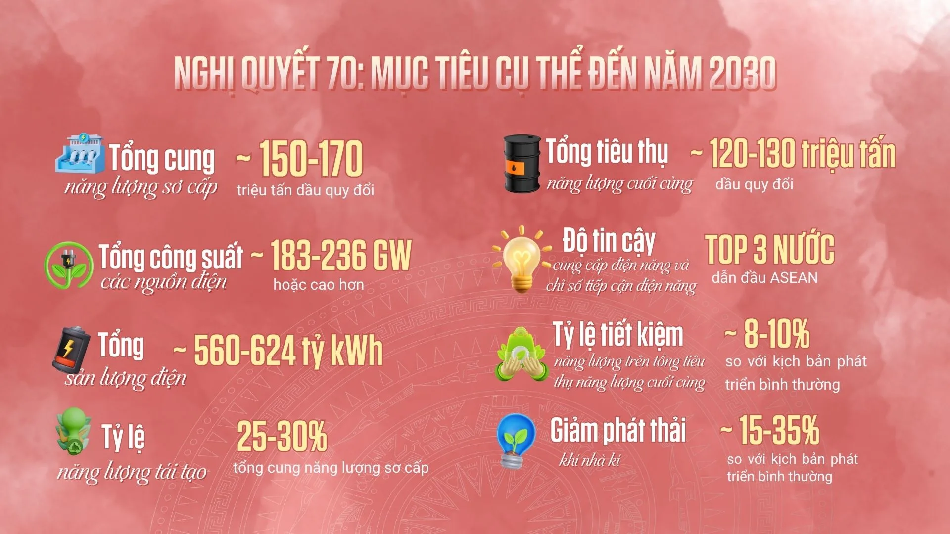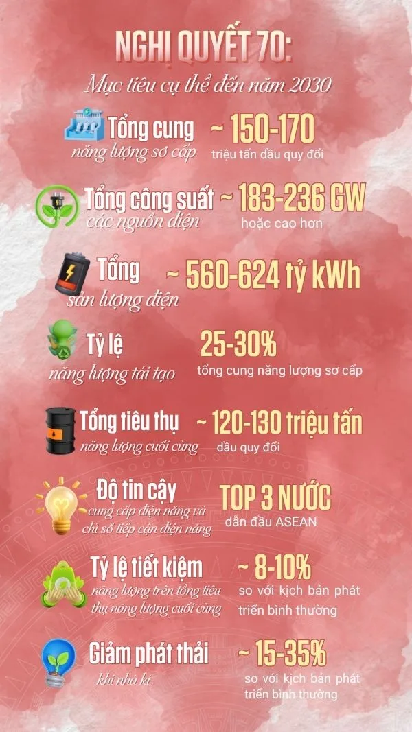 Về các nhóm mục tiêu đến năm 2030, Nghị quyết đặt mục tiêu vừa đủ cung ứng – hiện đại hóa hệ thống điện – đẩy mạnh năng lượng tái tạo – bảo đảm cung ứng đủ xăng dầu và LNG – nâng cao hiệu quả và giảm phát thải.