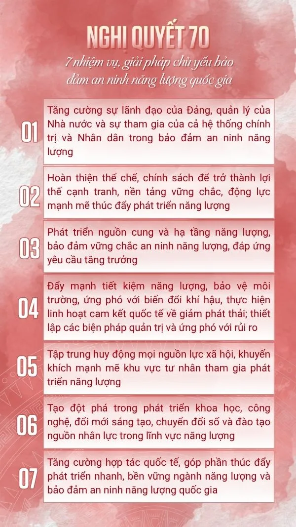 Nghị quyết 70 xác định 7 nhóm nhiệm vụ, giải pháp lớn để bảo đảm an ninh năng lượng quốc gia trong kỷ nguyên phát triển mới.