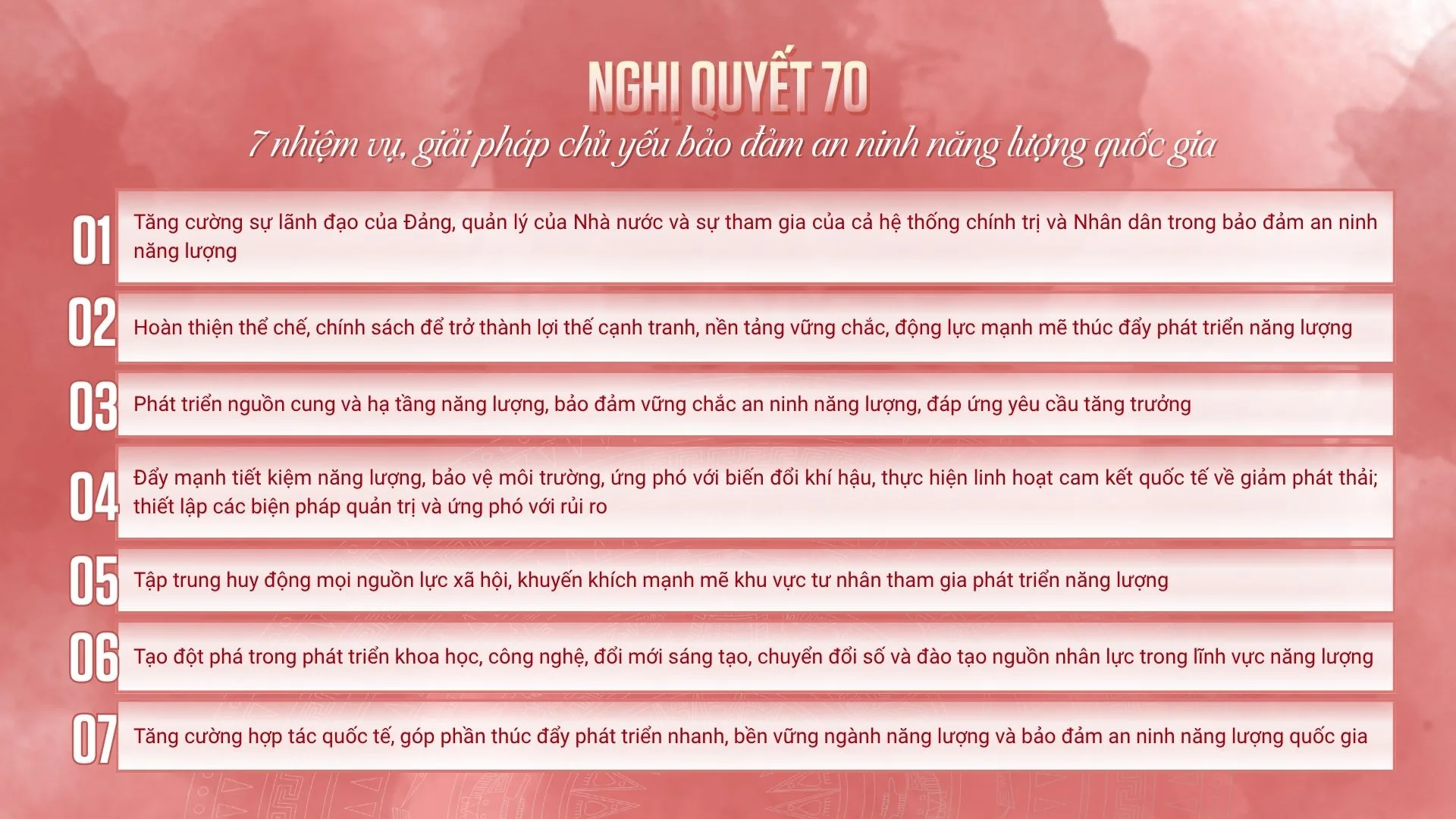 Nghị quyết 70 đề ra tư duy chiến lược bảo đảm vững chắc an ninh năng lượng quốc gia, đáp ứng yêu cầu phát triển đất nước trong kỷ nguyên mới – một vấn đề an ninh phi truyền thống mới. Nghị quyết xác định rõ an ninh năng lượng là một bộ phận trọng yếu của an ninh quốc gia, gắn trực tiếp với ổn định chính trị, phát triển kinh tế, quốc phòng – an ninh và hội nhập quốc tế.